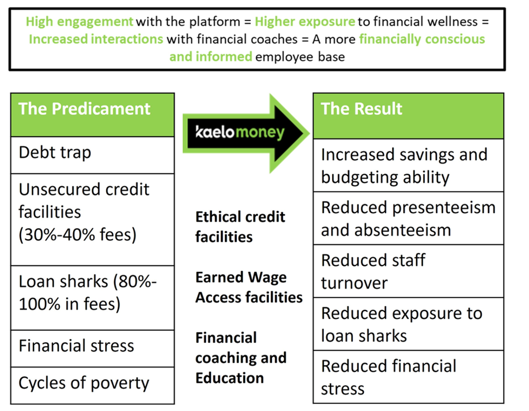 • Kaelo Money, through the combination of its Emergency Wallets, Earned Wage Access platform, Financial wellness tool and personalised financial coaching, affords employees the ability to escape the perpetual debt trap by consolidating their debt.