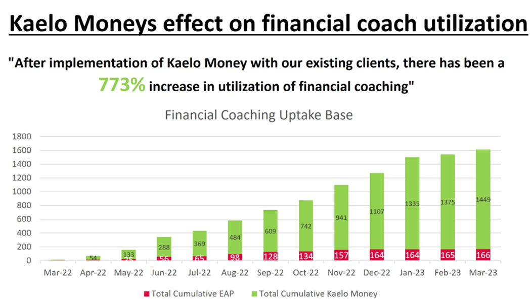 Through the constant reminders and engagement with the Kaelo Money platform, whether this be through the financial coach reminders upon every extension request (through the Emergency Wallet, Earned Wage Access Platform and Marketplace), the lending pattern identifier or the on platform financial coach request, Kaelo Money has significantly driven financial coach utilisation.